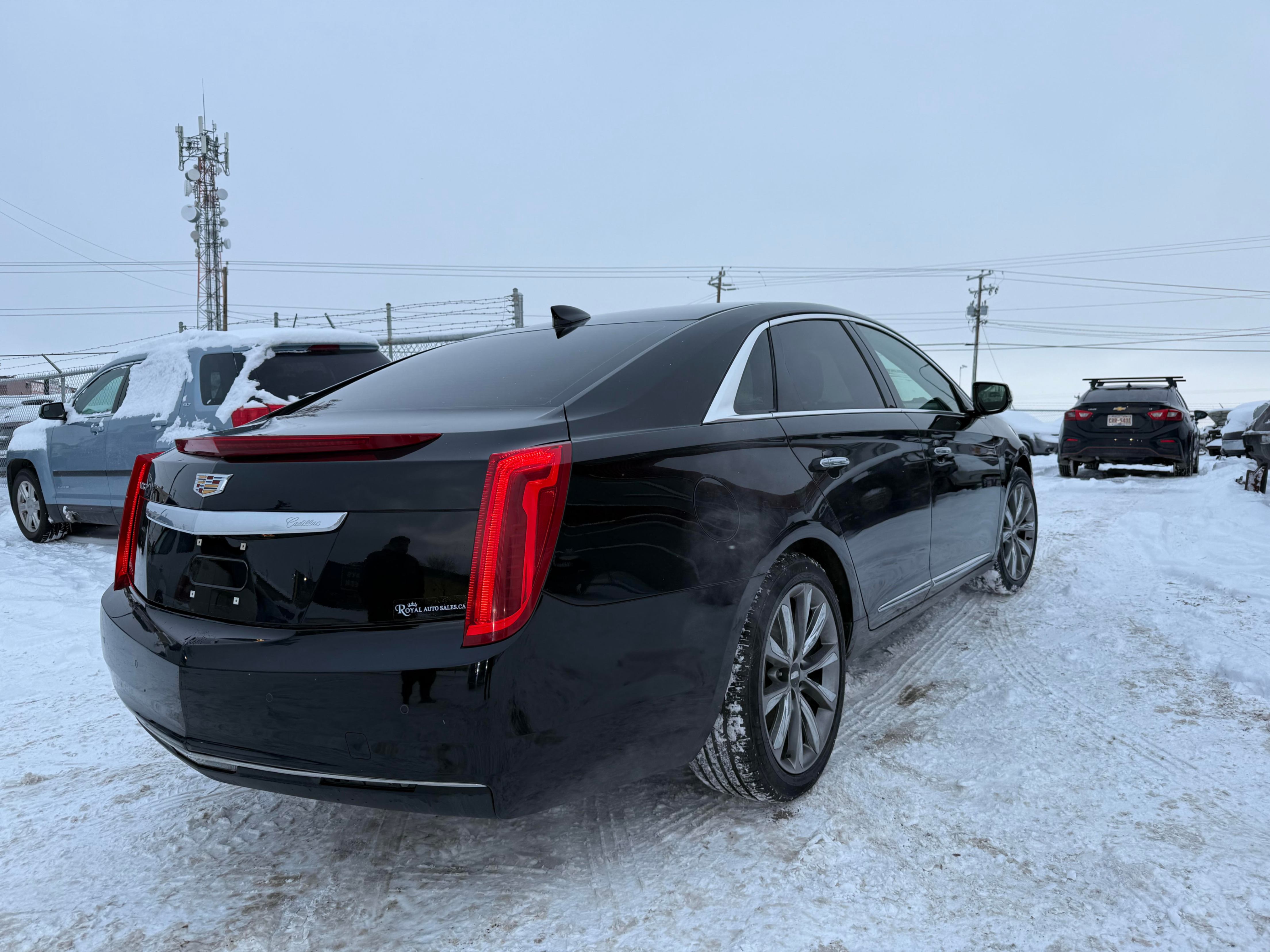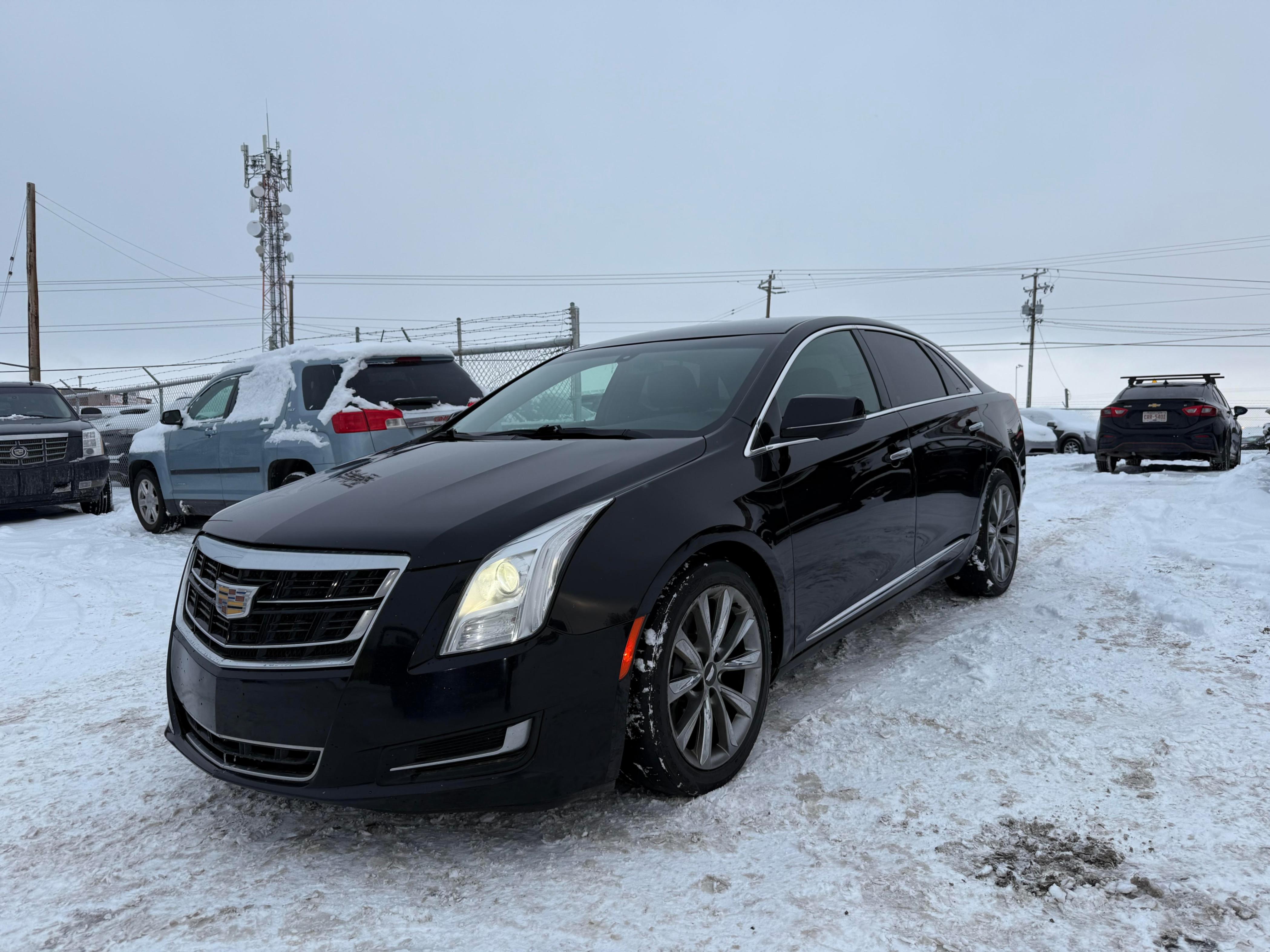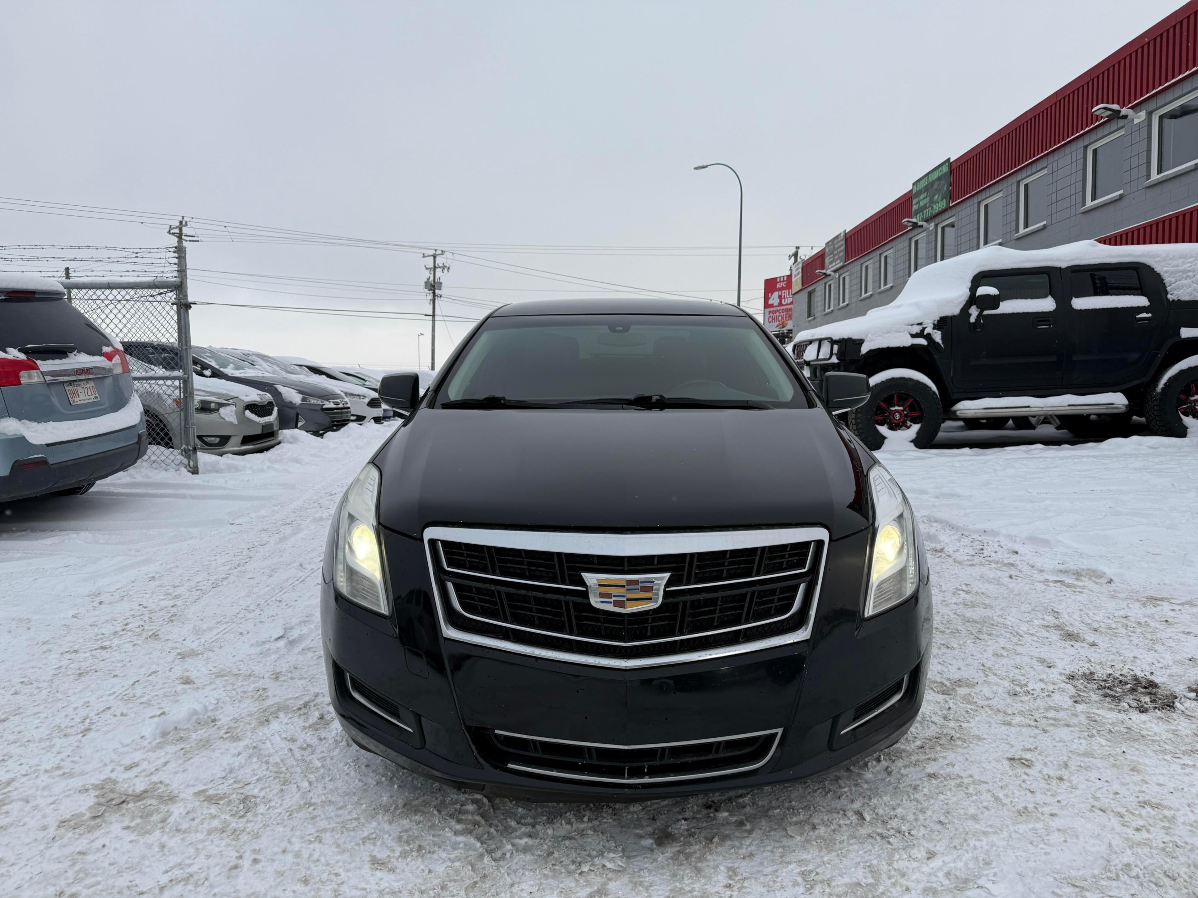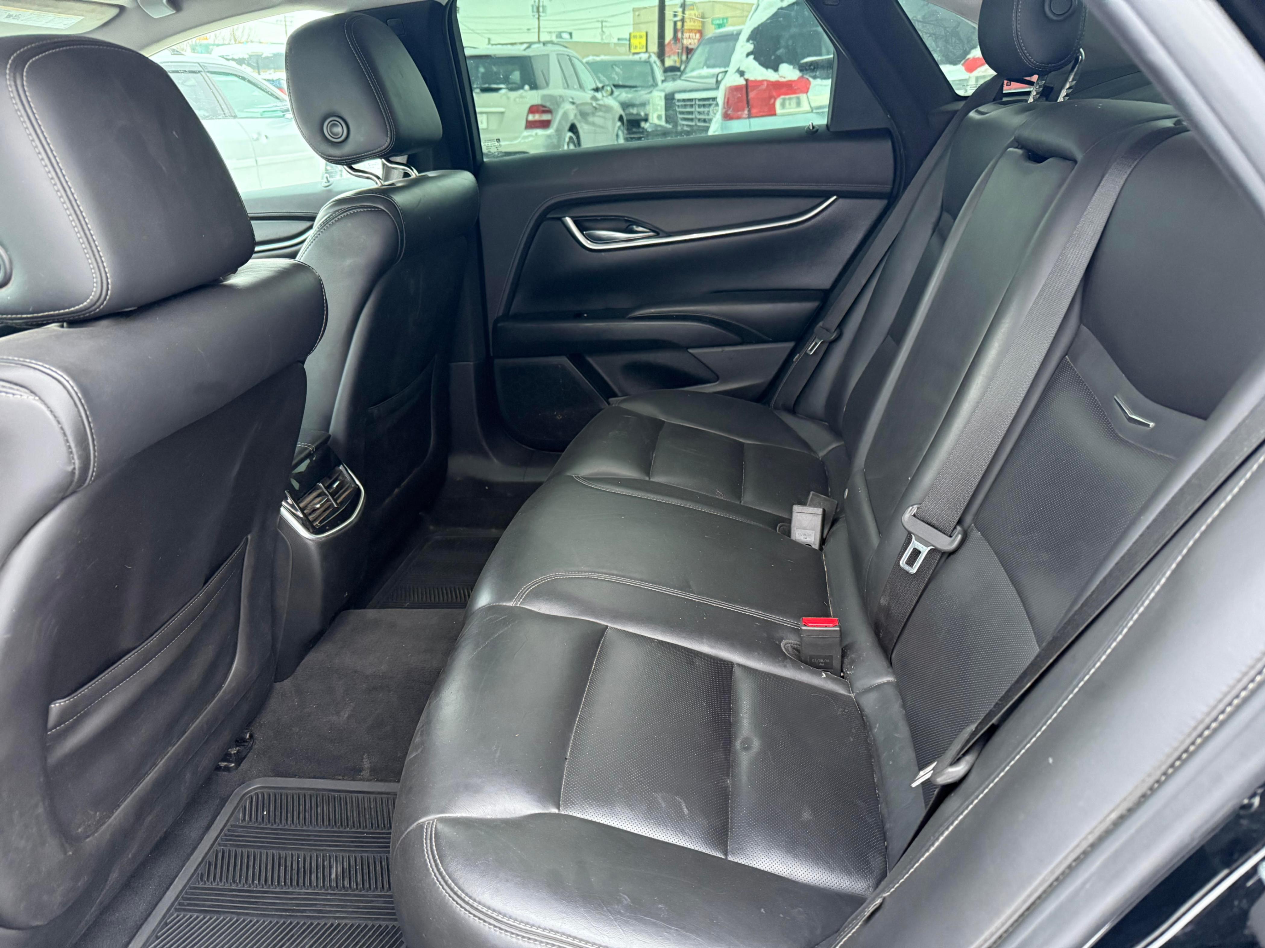 A 2017 black 4 door Cadillac XTS with black leather interior.